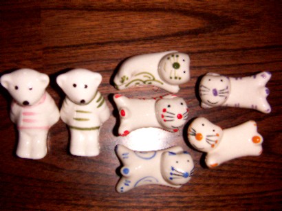 さて、久々のupなので、写真も入れちゃいます。これは食器をメインに扱う100円ショップでみつけた箸置きです。クマ好きなので、クマ(左2個)を買いましたが、ネコがとってもキュート。向きがちがったり、ポーズも3種類ぐらいあるので、全部揃えたいぐらい!(クマって、どんな製品もかわいくはないのが悩み)。実はウサギもあるのですが、顔は可愛いけどポーズがわるく、どてっと座り込んでいるので買ってません。ていうか、箸置きがどんどん増えても困るし。