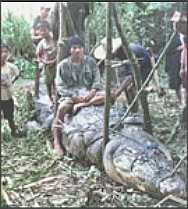 2002年4月17日付けInquirer参照 1500Kgのミンドロワニの生け捕り そうそう動物ネタはないだろうと思っていたら、いきなりまたありました。ワニの大きさとして世界でどのランクかは知らないけど、この大きさ!推定40歳、19フィートの身長、1500キロの重さのミンドロワニが住民(なぜか猟師とありますが)により、4月5日に生け捕りにされたということです。写真は、生け捕りのワニをグルグル巻にしたものです。 ミンドロ島はフィリピンで7番目に大きな島ですが、山岳部やジャングルんは先住民族が住み、農業と漁業が主な産業です。 |