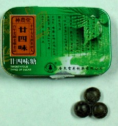 喉が痛いのなら、これ!台湾人の友達に薦められたお茶です。大箱に8つの小箱が入っていて、その1つ1つに4つの、まるで木炭のようなティーケーキが入ってます。かなり泥臭い匂い+味。熱湯で1つ、または2つを入れますが、特に風邪の場合は、生姜のスライスを入れて飲むと効果大とか。京華中薬行にて75ペソ。(2003年2月)