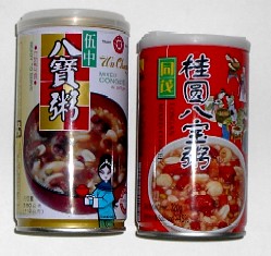 缶入り粥は、そのまま食べられるように、缶の蓋にスプーンもついています。温めても、そのまま冷たくてもOKの品。ちなみに粥とあっても砂糖いりの薄甘いもので、私的にはデザート。麦や緑豆、花生、紅豆、花豆、ロンガンなど盛りだくさんです。1缶37ペソ(2002年8月:Greenhillsの聊應斎(DEC)にて)