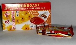 Greenhillsの京華中薬行でみつけたインスタントTea。18gの顆粒が10袋入りで105ペソ(2002年8月)。手軽に蜂蜜が取れ、さらに目の乾きや疲れをとり熱を下げる効果のある菊花とのブレンドといううれしい組み合わせ!