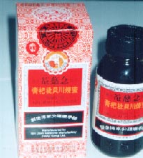 夏桑菊沖剤を買ったときに、薬局のおじさんが薦めてくれた薬(カプセル)。冲剤とともに使うといいとのアドバイスでした。カプセルですが、ビンをあけたとたんに独特の臭い。やっぱりこれも漢方系の薬です。主要成分は牛黄、金銀花、蓮翹をはじめ、珍珠(真珠)、桔梗、甘草、牛蒡子など。1回2カプセル、1日2・3回。30カプセル入り125ペソ(2003年2月)